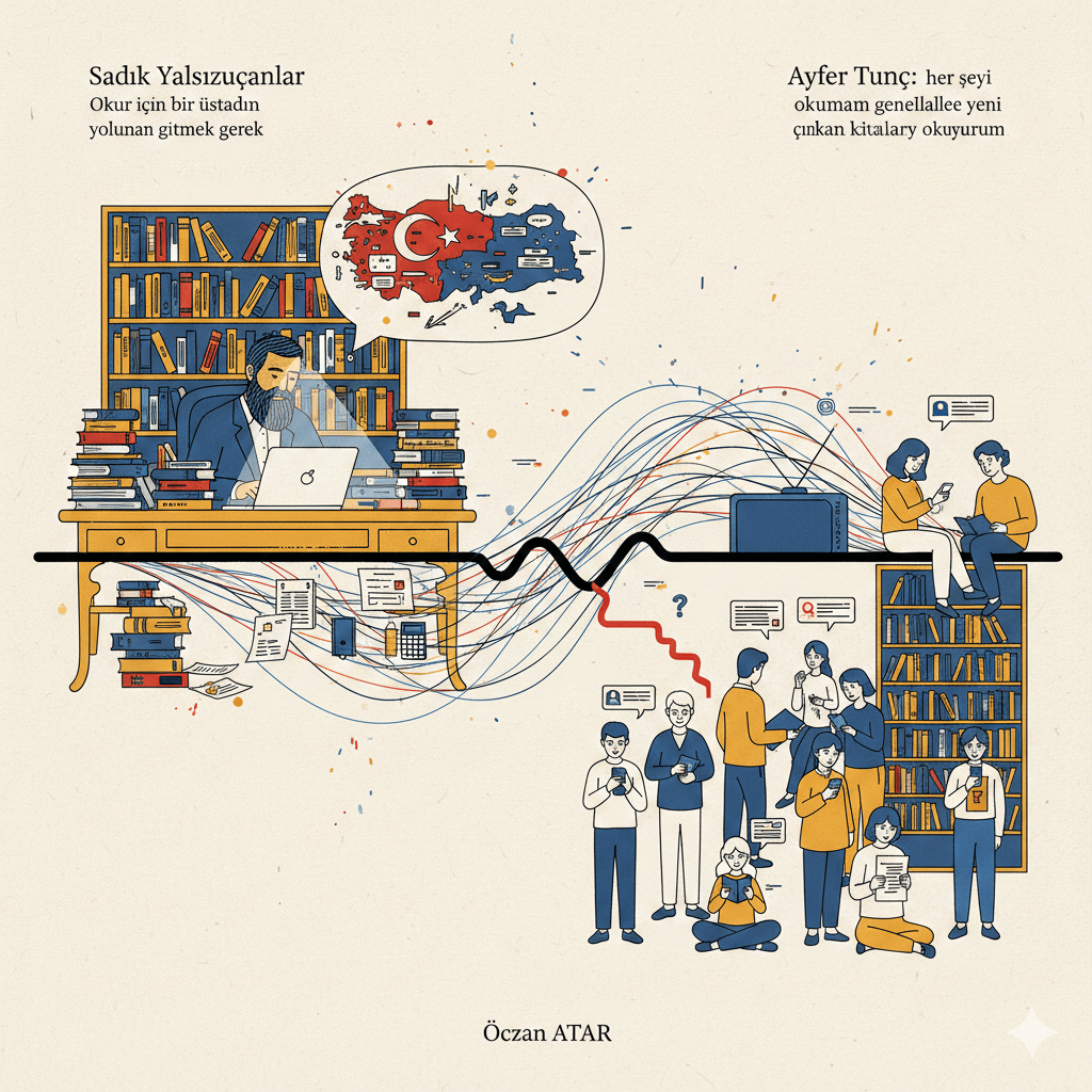 Sadık Yalsızuçanlar; “Okur için bir üstadın yolundan gitmek gerek,” diyor. O; Bediüzzaman, İbn-i Arabi ve Konevi’yi okumanın gerekliliğini savunurken Ayfer Tunç ise: “Her şeyi okumam, genellikle yeni çıkan kitapları okuyorum,” diyor. Her ikisi de neleri okumanın gerekli olduğu konusunda ayrılsalar da “nitelikli okurun” olmadığı noktasında hemfikirler.