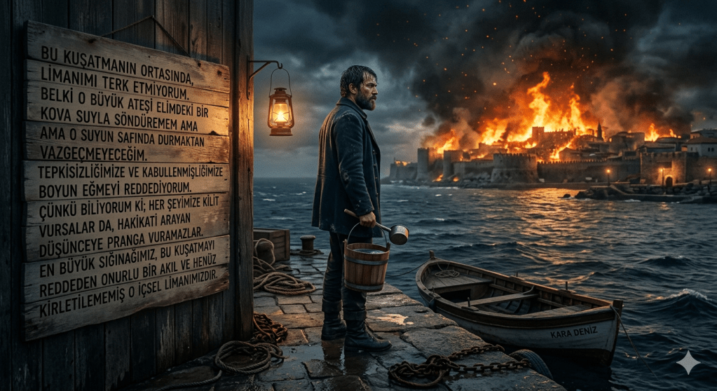 Bu kuşatmanın ortasında, limanımı terk etmiyorum. Belki o büyük ateşi elimdeki bir kova suyla söndüremem ama o suyun safında durmaktan vazgeçmeyeceğim. Tepkisizliğimize ve kabullenmişliğimize boyun eğmeyi reddediyorum. Çünkü biliyorum ki; her şeyimize kilit vursalar da, hakikati arayan düşünceye pranga vuramazlar. En büyük sığınağımız, bu kuşatmayı reddeden onurlu bir akıl ve henüz kirletilememiş o içsel limanımızdır.
