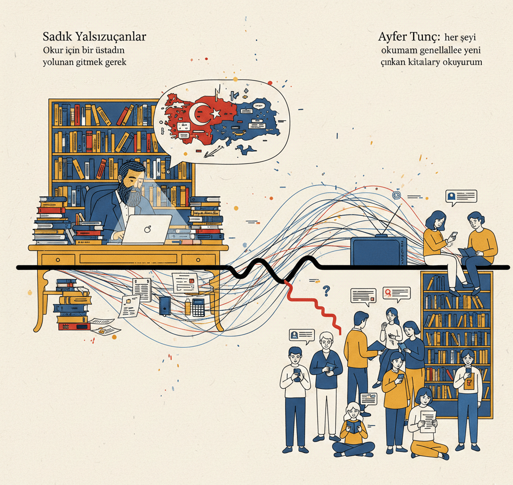 Sadık Yalsızuçanlar; “Okur için bir üstadın yolundan gitmek gerek,” diyor. O; Bediüzzaman, İbn-i Arabi ve Konevi’yi okumanın gerekliliğini savunurken Ayfer Tunç ise: “Her şeyi okumam, genellikle yeni çıkan kitapları okuyorum,” diyor. Her ikisi de neleri okumanın gerekli olduğu konusunda ayrılsalar da “nitelikli okurun” olmadığı noktasında hemfikirler.